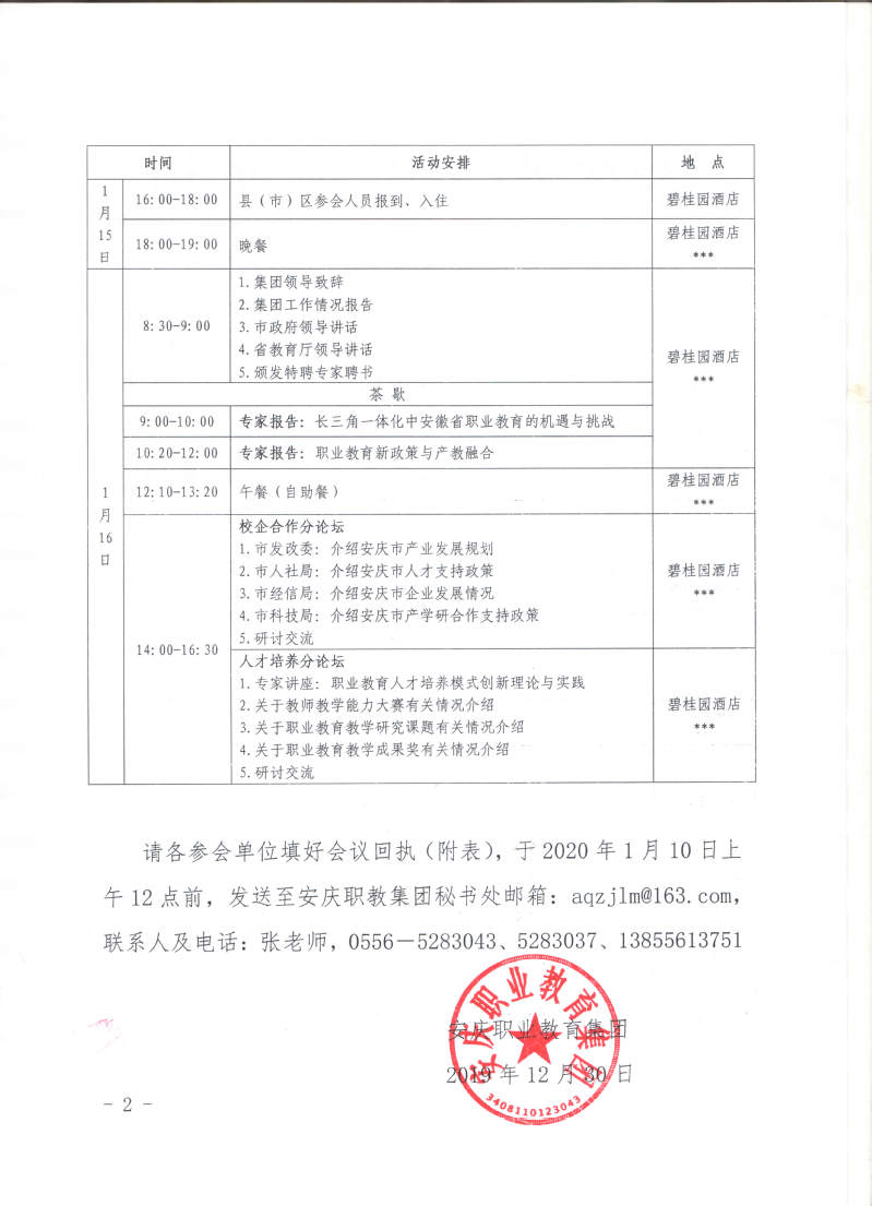 安慶職教集團(tuán)擬定于2020年1月16日召開(kāi)集團(tuán)年會(huì)暨高質(zhì)量發(fā)展論壇,請(qǐng)各參會(huì)單位填好會(huì)議回執(zhí)(附表),于2020年1月10日上午12點(diǎn)前,發(fā)送至安慶職教集團(tuán)秘書(shū)處郵箱:aqzjlm@163.com。參會(huì)回執(zhí)見(jiàn)附件2。