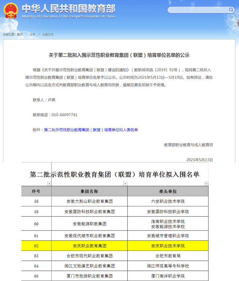 喜報:安慶職業(yè)教育集團(tuán)入圍國家示范性職業(yè)教育集團(tuán)(聯(lián)盟)培育單位