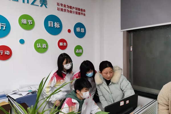 第二天,部分學(xué)生代表來到協(xié)成財務(wù)咨詢有限公司參觀、座談,三人一組在師傅帶領(lǐng)下上機(jī)操作,現(xiàn)場體驗(yàn)真實(shí)的財務(wù)和稅收系統(tǒng)。