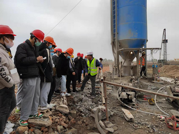 兩個(gè)施工項(xiàng)目分別由中鐵十七局與中鐵十六局承建。項(xiàng)目涵蓋了水泥攪拌樁地基加固、路基施工(土工格柵)、明挖法、隧道臺(tái)階開挖法、隧道模板襯砌等施工工藝。每個(gè)項(xiàng)目現(xiàn)場,由項(xiàng)目部工程師分組給同學(xué)們講解各施工流程的技術(shù)要點(diǎn),并且對(duì)同學(xué)們提出的問題給與現(xiàn)場解答。