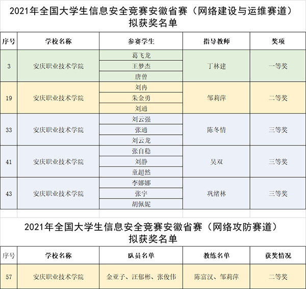日前,由安徽省教育廳主辦,合肥工業(yè)大學(xué)、安徽理工大學(xué)、合肥學(xué)院、合肥職業(yè)技術(shù)學(xué)院、安徽郵電職業(yè)技術(shù)學(xué)院等院校承辦的2021年全國大學(xué)生信息安全競賽(安徽賽區(qū))比賽結(jié)果公布,安慶職業(yè)技術(shù)學(xué)院信息技術(shù)學(xué)院選手團(tuán)結(jié)一心,頑強(qiáng)拼搏,共取得一等獎(jiǎng)1項(xiàng)、二等獎(jiǎng)2項(xiàng)、三等獎(jiǎng)3項(xiàng)的優(yōu)異成績。