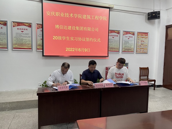 6月9日下午,安慶職業(yè)技術(shù)學(xué)院建筑工程學(xué)院與博信達建設(shè)集團有限公司關(guān)于20級學(xué)生實習(xí)協(xié)議簽約儀式隆重舉行,博信達建設(shè)集團有限公司總經(jīng)理張羽、建筑工程學(xué)院院長陳月萍及校企雙方部門負(fù)責(zé)人出席了儀式,該院黨總支副書記葉彤主持儀式,2020級實習(xí)學(xué)生代表參加了儀式。