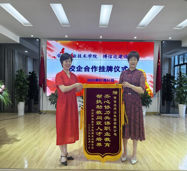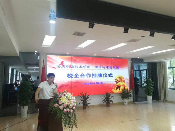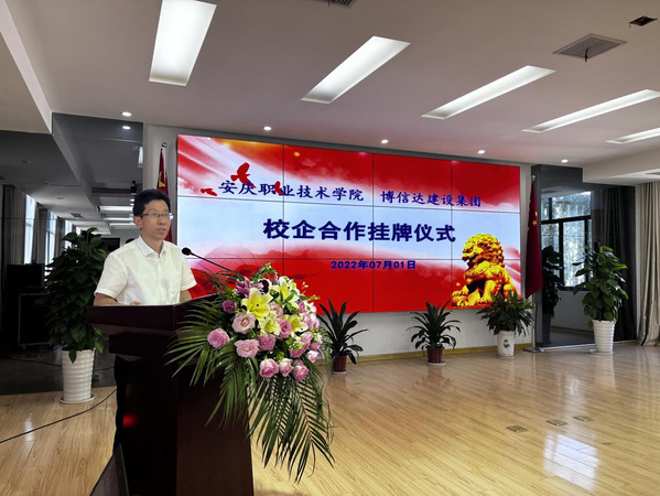 為進(jìn)一步深化校企合作協(xié)同育人,7月1日下午,安慶職業(yè)技術(shù)學(xué)院與博信達(dá)建設(shè)集團(tuán)有限公司隆重舉行校企合作揭牌儀式,安慶職院校長畢明生教授、博信達(dá)建設(shè)集團(tuán)有限公司董事長汪賢勇出席揭牌儀式,企業(yè)各職能部門負(fù)責(zé)同志、安慶職院建筑工程學(xué)院負(fù)責(zé)人及相關(guān)教師代表參加揭牌儀式。