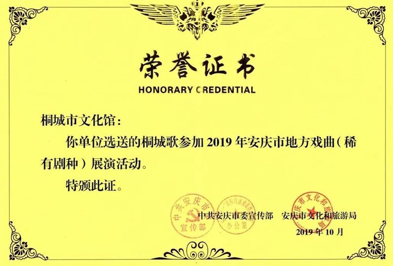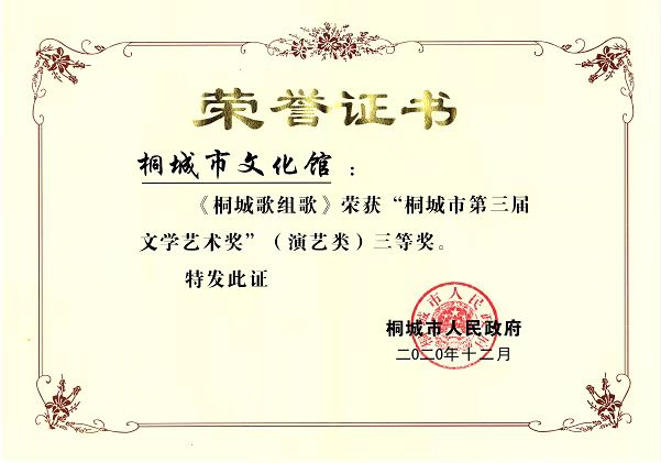 市文化館攜手中華職校開(kāi)展豐富的“桐城歌”傳承傳習(xí)活動(dòng),組織業(yè)務(wù)人員對(duì)學(xué)生們的聲腔、方言、舞蹈動(dòng)作進(jìn)行專(zhuān)業(yè)系統(tǒng)培訓(xùn),演繹富有鄉(xiāng)土氣息的桐城歌音樂(lè)作品《桐城歌組歌》。2019年10月作品入選參加由中共安慶市委宣傳部、安慶市文化和旅游局舉辦的2019年安慶市地方戲曲(稀有劇種)展演活動(dòng),獲得一致好評(píng);2020年12月作品獲桐城市人民政府頒發(fā)的“第三屆文學(xué)藝術(shù)獎(jiǎng)”(演藝類(lèi))三等獎(jiǎng)。