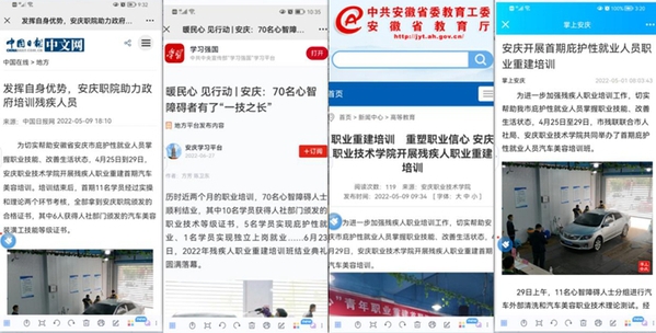 安慶職院作為省、市兩級殘疾人技能培訓基地,一直以高度社會責任感開展殘疾人職業(yè)技能培訓,致力于服務好每一位社會殘障人士。幫助他們掌握了一定的職業(yè)技能,增強他們熱愛生活、融入社會的信心,用熱情給大量殘疾人家庭帶來了活力與希望。開展“殘疾人職業(yè)重建”培訓項目以來,面向安慶市心智障礙人士提供了諸如面點、插花、烘焙、汽車美容、短視頻制作等技能培訓,還針對他們自卑、焦躁等負面情緒,開設了藝術(shù)調(diào)理類等心理輔導課程,幫助他們調(diào)節(jié)身心。僅今年上半年就有11名學員通過汽車美容和烘焙技能考核,獲得人社部門頒發(fā)的職業(yè)資格證書,并推薦到愛心企業(yè)實現(xiàn)就業(yè)。先后被中國日報、學習強國、安徽省教育廳、安徽省殘聯(lián)等單位報道。