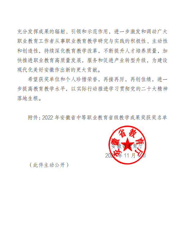 近日,安徽省教育廳公布了標(biāo)志著全省中等職業(yè)教育教學(xué)最高水平的2022年安徽省教學(xué)成果獎(jiǎng)評選結(jié)果。根據(jù)安徽省教育廳下發(fā)的《安徽省教育廳關(guān)于公布 2022 年安徽省中等職業(yè)教育省級教學(xué)成果獎(jiǎng)獲獎(jiǎng)項(xiàng)目的通知》(皖教秘職成〔202277 號)文件,安徽理工學(xué)校報(bào)送的兩項(xiàng)教學(xué)成果分別獲得特等獎(jiǎng)、一等獎(jiǎng),安慶工業(yè)學(xué)校報(bào)送的教學(xué)成果獲得一等獎(jiǎng)。