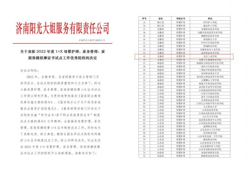 近日,安慶工業(yè)學(xué)校被教育部培訓(xùn)評(píng)價(jià)組織單位授予2022年度‘1+X’制度試點(diǎn)工作母嬰護(hù)理職業(yè)技能等級(jí)證書“優(yōu)秀試點(diǎn)院校”榮譽(yù)稱號(hào)。