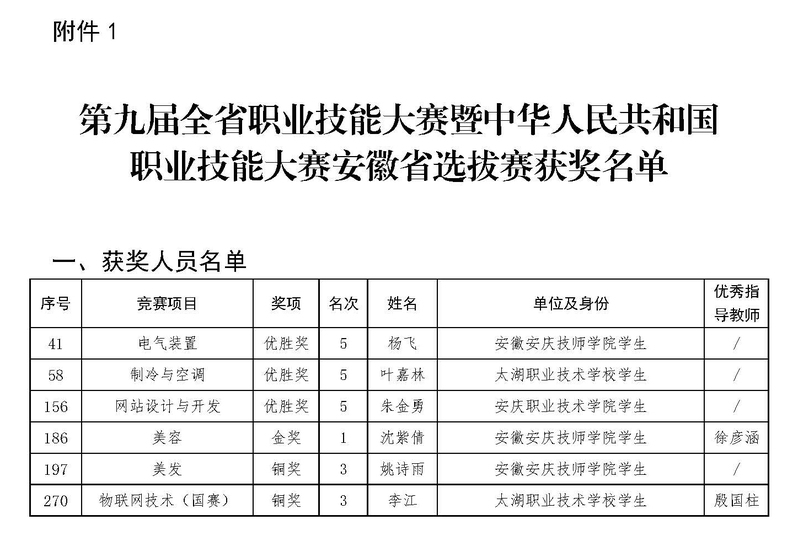 近日,安徽省人力資源和社會(huì)保障廳發(fā)布《關(guān)于公布第九屆全省職業(yè)技能大賽等2022年四項(xiàng)省級(jí)職業(yè)技能競(jìng)賽獲獎(jiǎng)名單的通知》(皖人社秘〔2023〕15號(hào)),集團(tuán)成員學(xué)校安慶職業(yè)技術(shù)學(xué)院、安徽安慶技師學(xué)院、太湖職業(yè)技術(shù)學(xué)校在第九屆全省職業(yè)技能大賽及2022年省級(jí)職業(yè)技能競(jìng)賽中取得佳績。