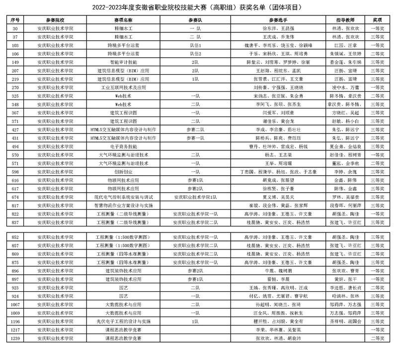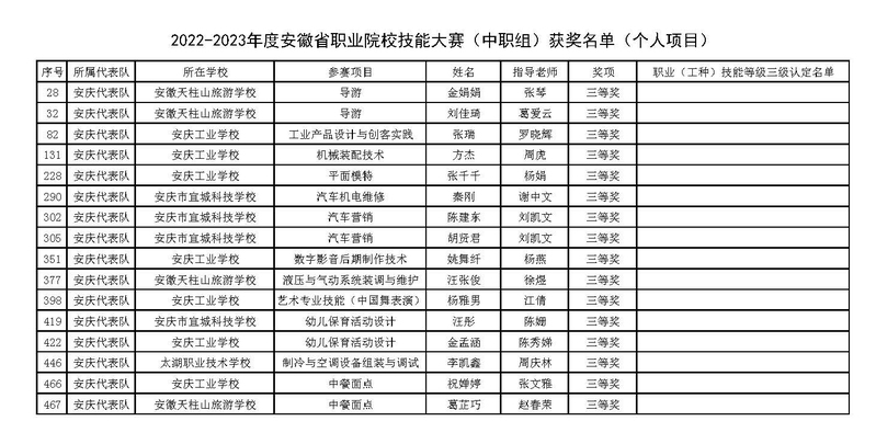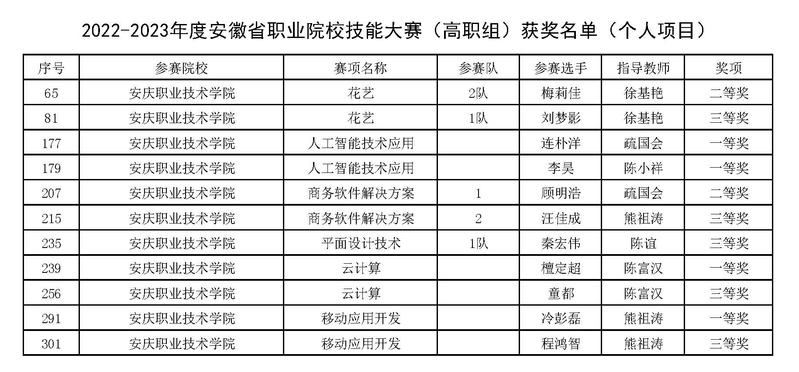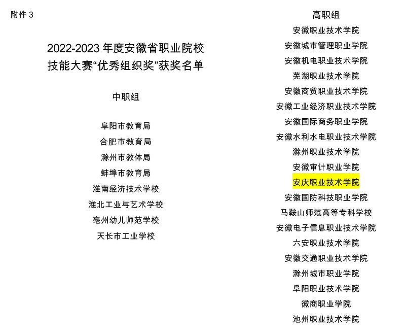 近日,安徽省教育廳、安徽省經(jīng)濟(jì)和信息化廳、安徽省人力資源和社會(huì)保障廳公布了2022-2023年度安徽省職業(yè)院校技能大賽獲獎(jiǎng)名單,安慶職業(yè)技術(shù)學(xué)院和5所中職學(xué)校部分項(xiàng)目獲獎(jiǎng)。