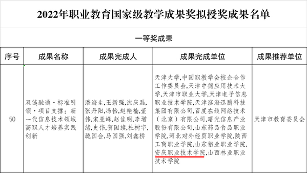 5月15日,教育部就評選出的2022年職業(yè)教育國家級教學成果獎擬授獎成果進行公示。安慶職業(yè)技術學院參與的“雙鏈融通·體系引領·項目支撐:新一代信息技術領域高職人才培養(yǎng)實踐創(chuàng)新”項目榮獲國家教學成果獎一等獎。該項目由天津大學牽頭,中國職教學會校企合作工作委員會指導,安慶職業(yè)技術學院、天津中德應用技術大學、天津市職業(yè)大學等九所職業(yè)本科和高職院校,天津濱海迅騰科技集團、百度在線網絡技術(北京)有限公司、曙光信息產業(yè)股份有限公司等三家企業(yè)共同參與,在制度建立、標準制定和創(chuàng)新實踐上進行了深度探索和應用,取得了一系列高質量理論和實踐成果。