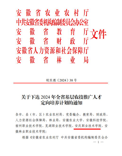 近日,安徽省農業(yè)農村廳等六部門聯(lián)合印發(fā)《關于下達 2024 年全省基層農技推廣人才定向培養(yǎng)計劃的通知》,安慶職業(yè)技術學院被定為安徽省基層農技推廣人才定向培養(yǎng)高校。