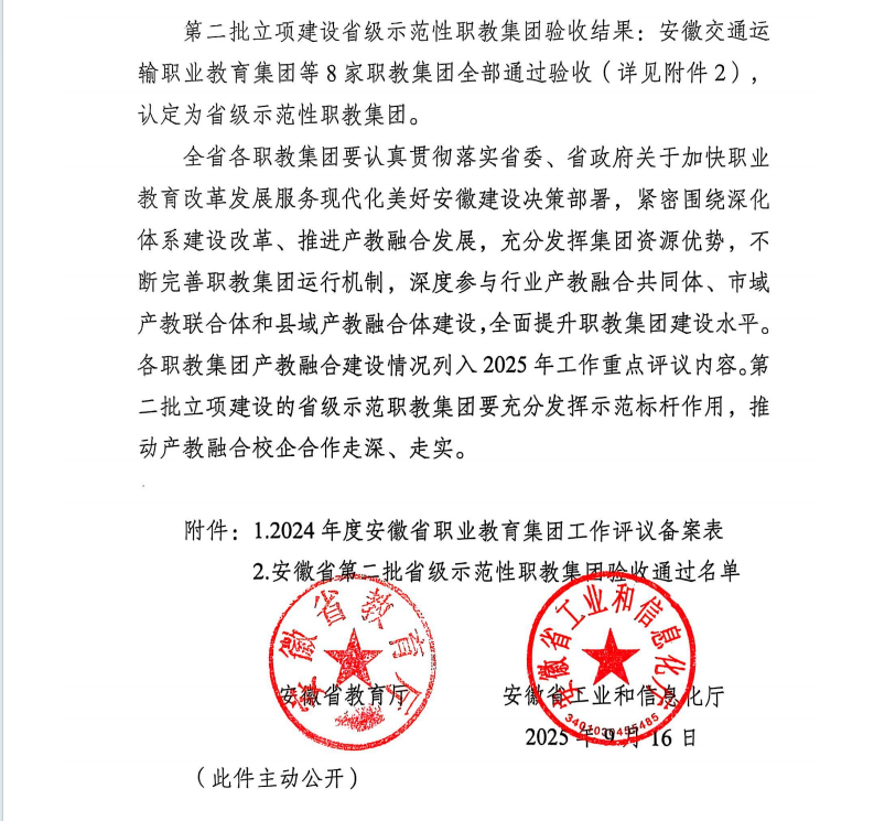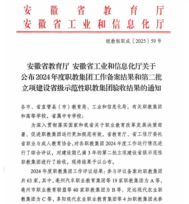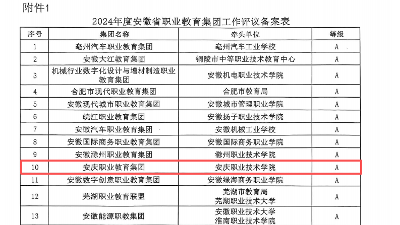 近日,安徽省教育廳、安徽省工業(yè)和信息化廳共同發(fā)文,安慶職教集團(tuán)在全省63家職教集團(tuán)2024年度工作運(yùn)行情況綜合評(píng)價(jià)中,以卓越的表現(xiàn)和顯著的成果再度獲評(píng)安徽省A類(lèi)職教集團(tuán),實(shí)現(xiàn)連續(xù)七年榮獲安徽省A類(lèi)職教集團(tuán)稱(chēng)號(hào)。