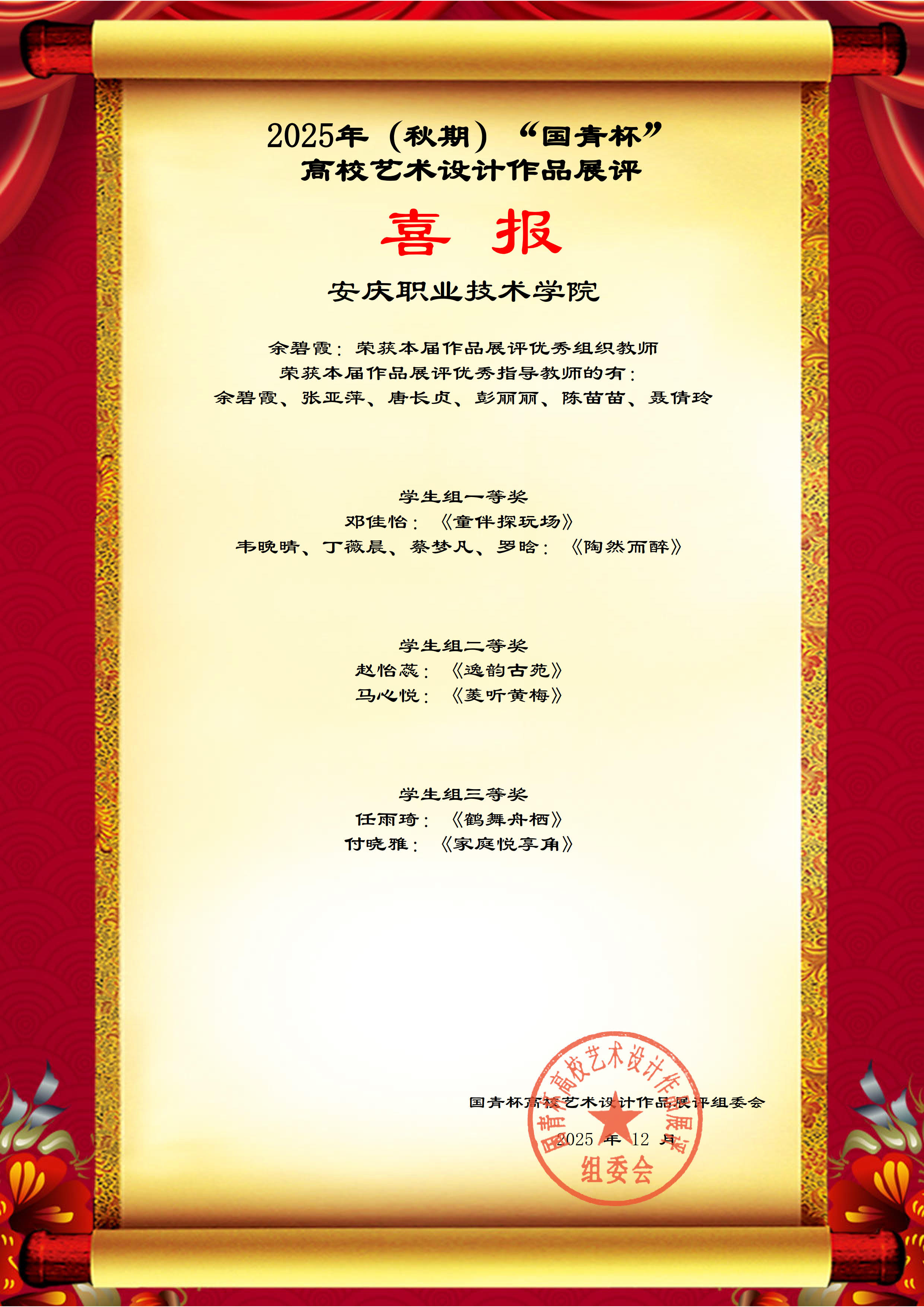 近日,2025年“國青杯”全國高校藝術設計作品展評活動結果揭曉,經(jīng)過安慶職業(yè)技術學院師生的共同努力,共有6件作品獲獎。