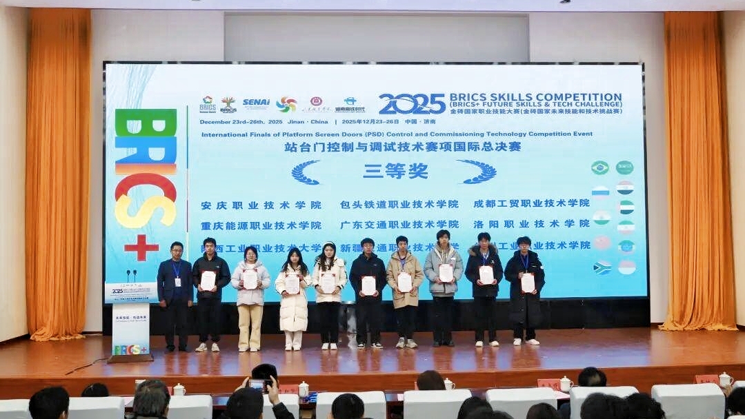 12月22日至26日,2025金磚國(guó)家職業(yè)技能大賽站臺(tái)門控制與調(diào)試技術(shù)賽項(xiàng)國(guó)際總決賽在山東職業(yè)學(xué)院舉行。安慶職業(yè)技術(shù)學(xué)院機(jī)電工程學(xué)院李陶勝、王淑芳兩位老師指導(dǎo)馮術(shù)鵬、張宇航兩位學(xué)生獲得三等獎(jiǎng)。